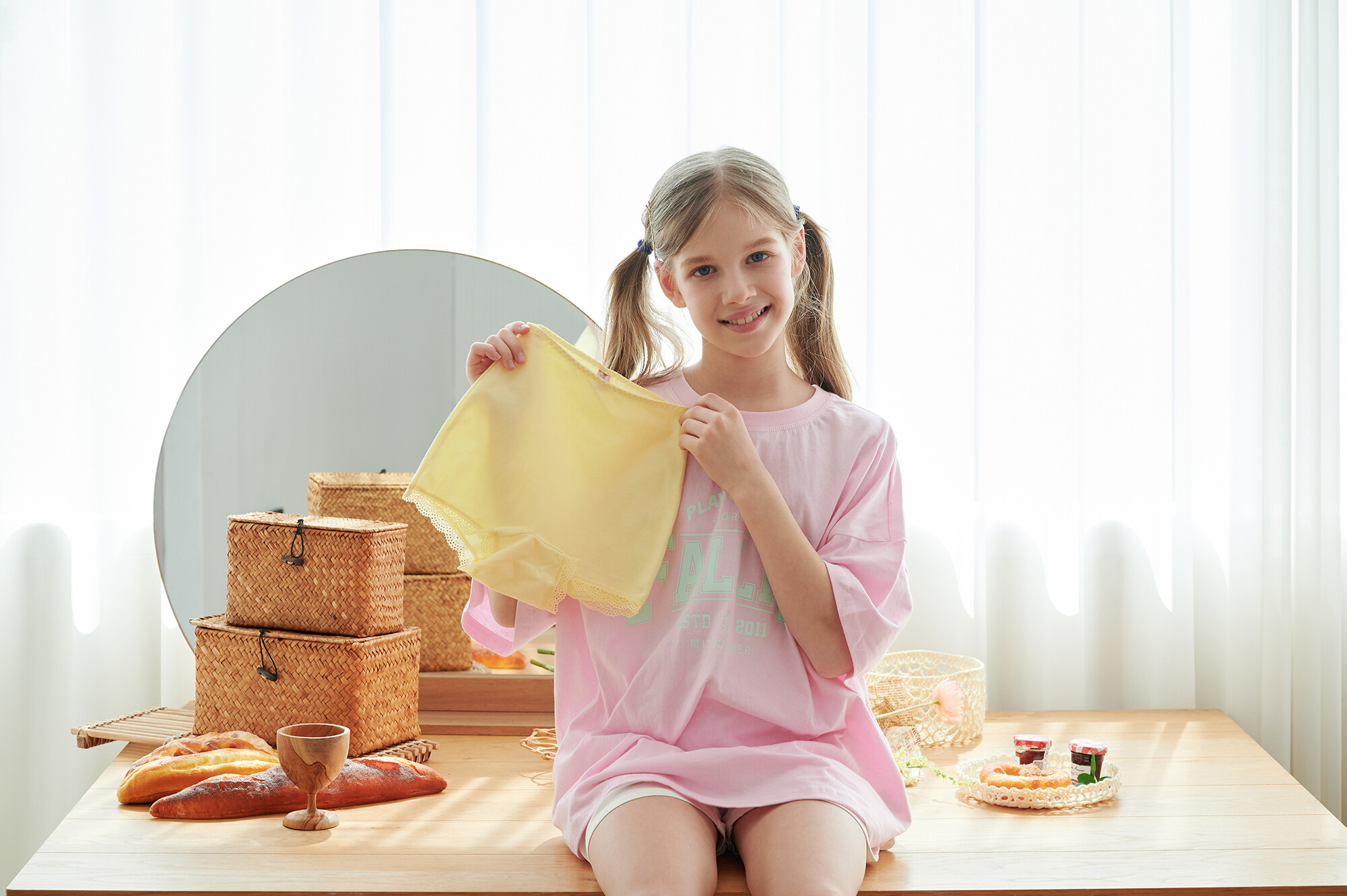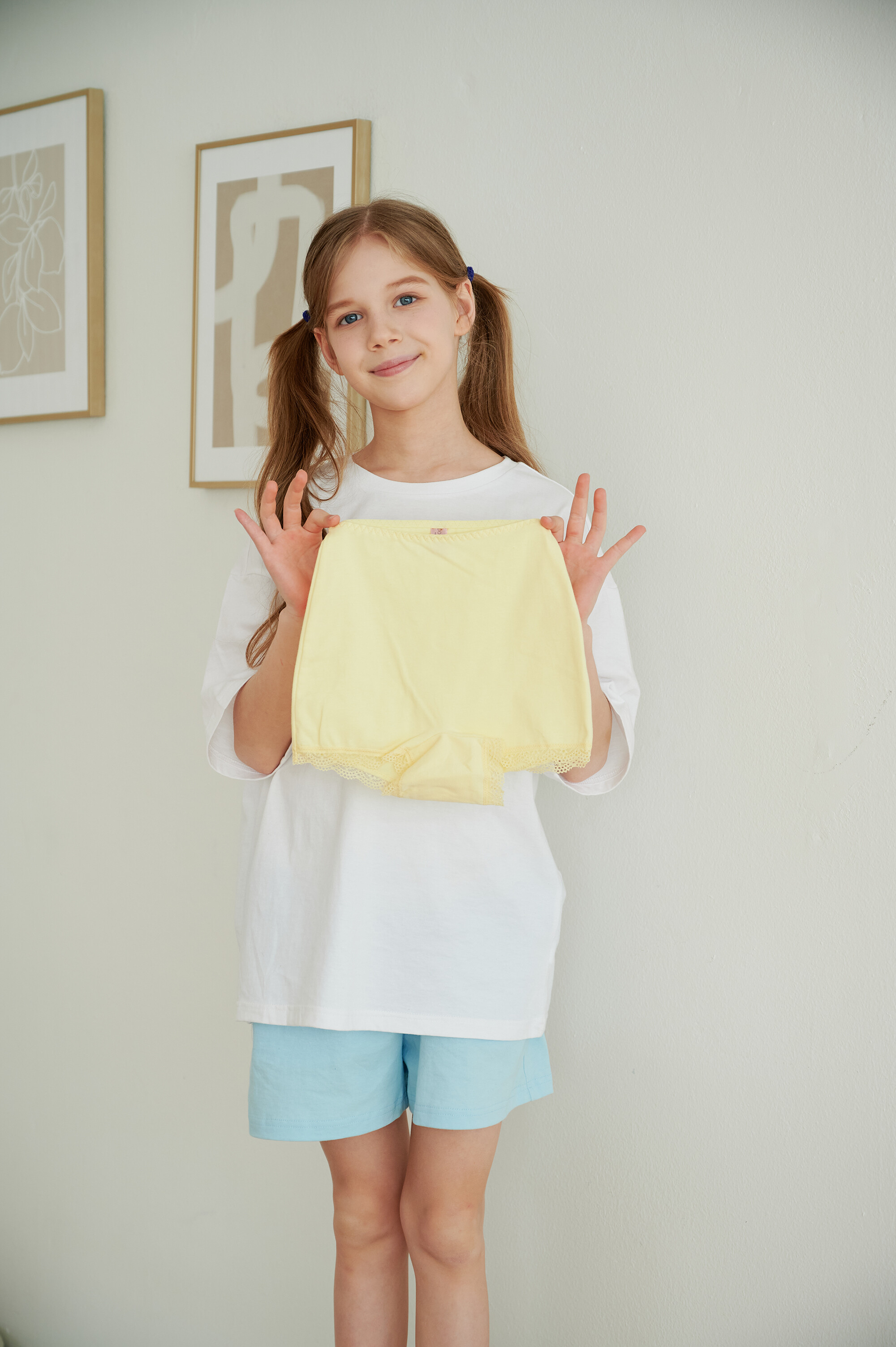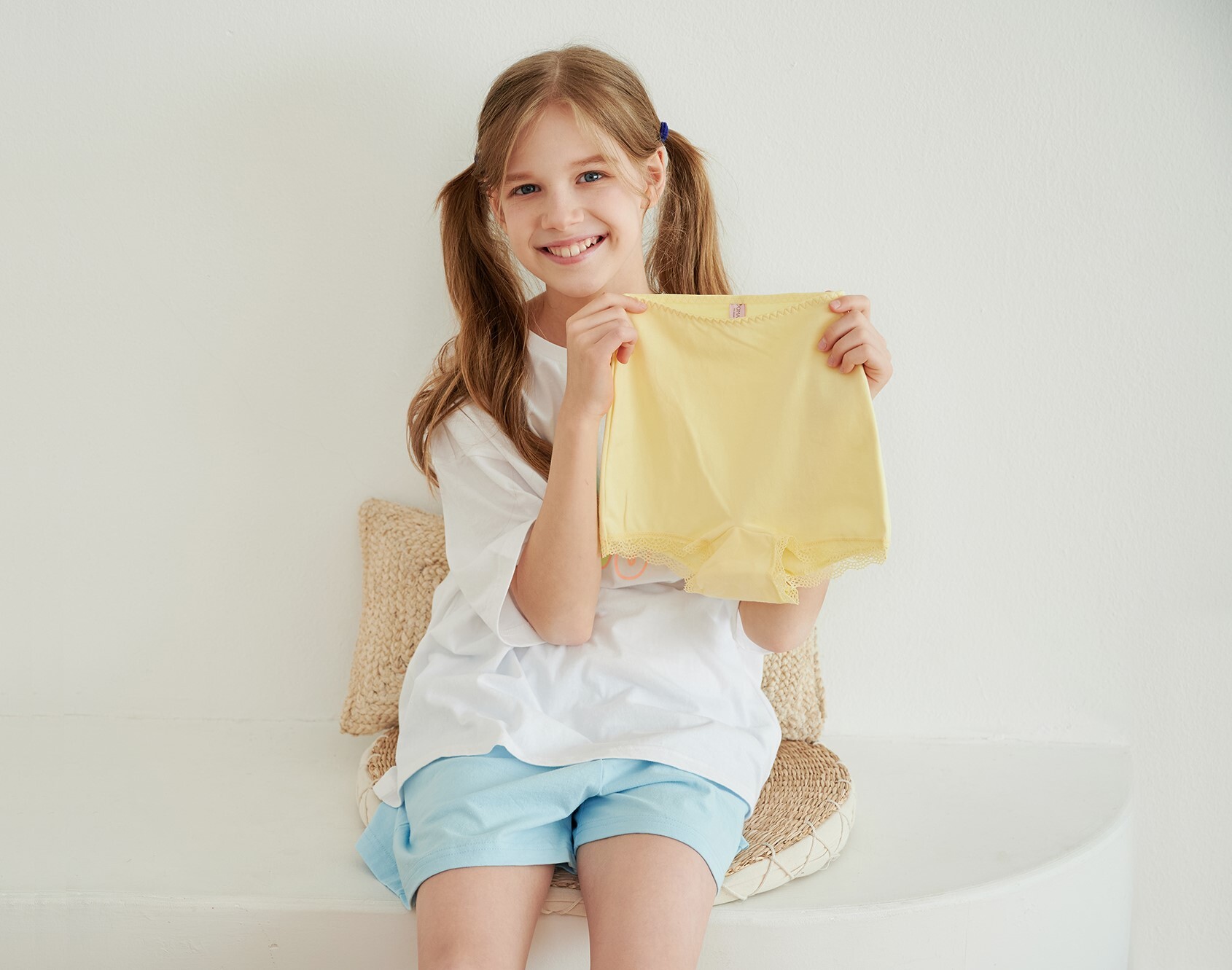 분리형 순면 안감으로 생리대 탈부착 가능하도록 하여 아이가 불편하지 않도록 하였고 높은 허리선으로 복부를 편안하게 감싸줍니다.