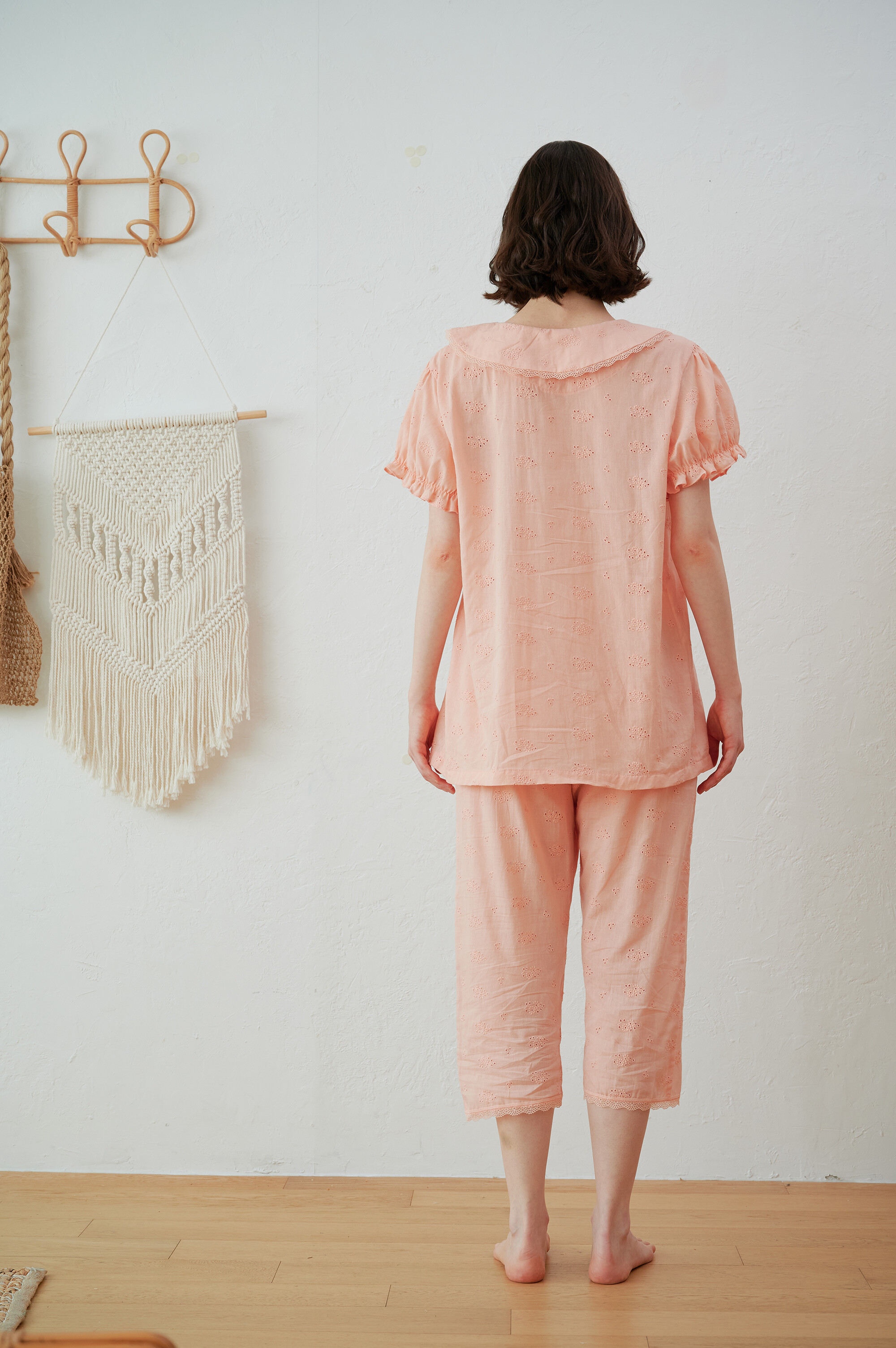 둥근 네크라인 고급스런 레이스를 덧대어 귀엽고 사랑스런 무드를 연출합니다. 소매에 밴드를 넣어 볼륨감과 활동성을 높였어요.
